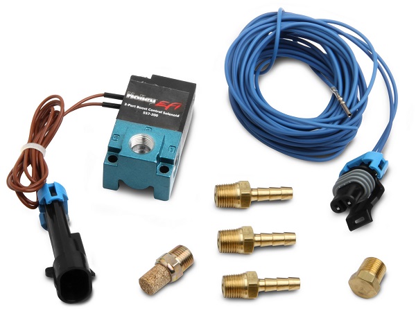 Holley’s 3 port boost control solenoid is designed for optimal performance when using the boost control function of Holley EFI. Some setups require two solenoids and some require one. The solenoid is driven by a Pulse Width Modulated (PWM) output of the ECU. It is advised NOT to use the PWM+ outputs on an HP ECU, but rather use the PWM- Outputs. If you have a Dominator ECU, either use the PWM- outputs, or use a PWM+ output on the J2B connector.