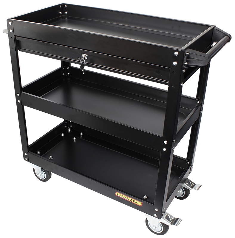 The Aeroflow Performance 3 tier workshop trolley with lockable drawer is a highly practical addition to your home workshop or garage when it comes to storing or moving tools and car parts. This workshop trolley features 4 heavy duty caster wheels that make moving around the workshop floor a breeze and with two locking wheels it should stay put where you want it to. It has a powder coated black finish equipped with lots of storage space including a tool hanger attached on the side. To stop those valuable items mysteriously walking away the ball bearing lockable draw is a great feature with two keys included.